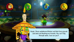 Diggerling can participate in the mini-games added in Trouble in Paradise. As an opponent, he will use a Profitamole.
