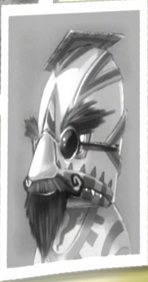 Professor Pester is a relatively short and squat human (though not as short as his Ruffian minions). His mask is tall and red, with triangular green "angry eyes", matching the designs of Ruffians and sours. He wears a graduation cap, reflecting his professorial title. He has a red shirt with geometric patterns around the sleeves and neck, with a darker red stripe running down the middle. His shirt also exposes the skin of his forearms and chest, showing patterns reminiscent of tribal tattoos or possibly chest hair (again, similar to the patterns on Ruffians and sours). He wears a dark red belt with a yellow zig-zag pattern and a golden buckle in the center. His pants are adorned with alternating red and dark red stripes, as are his pointed shoes, which are reminiscent of medieval winklepickers.